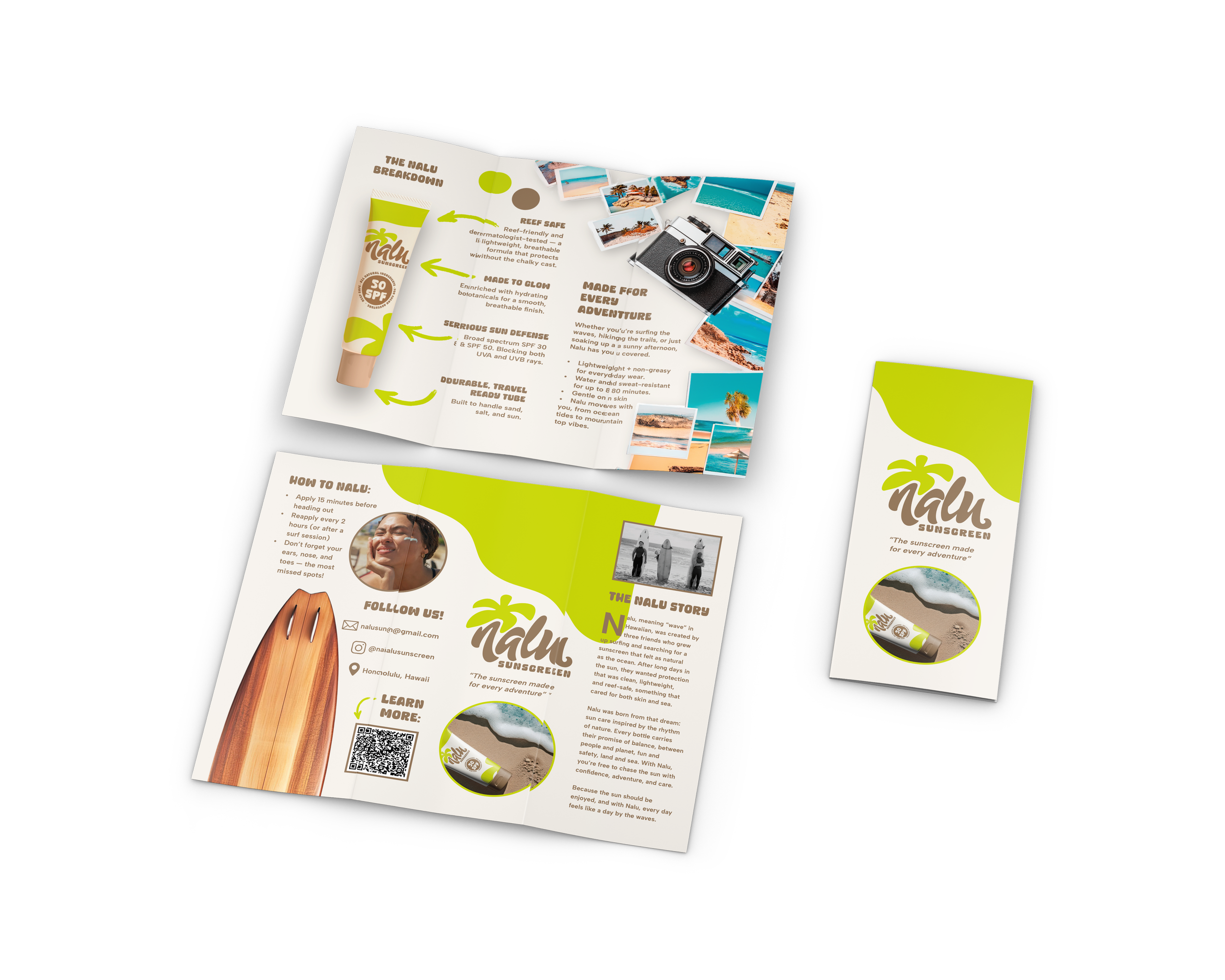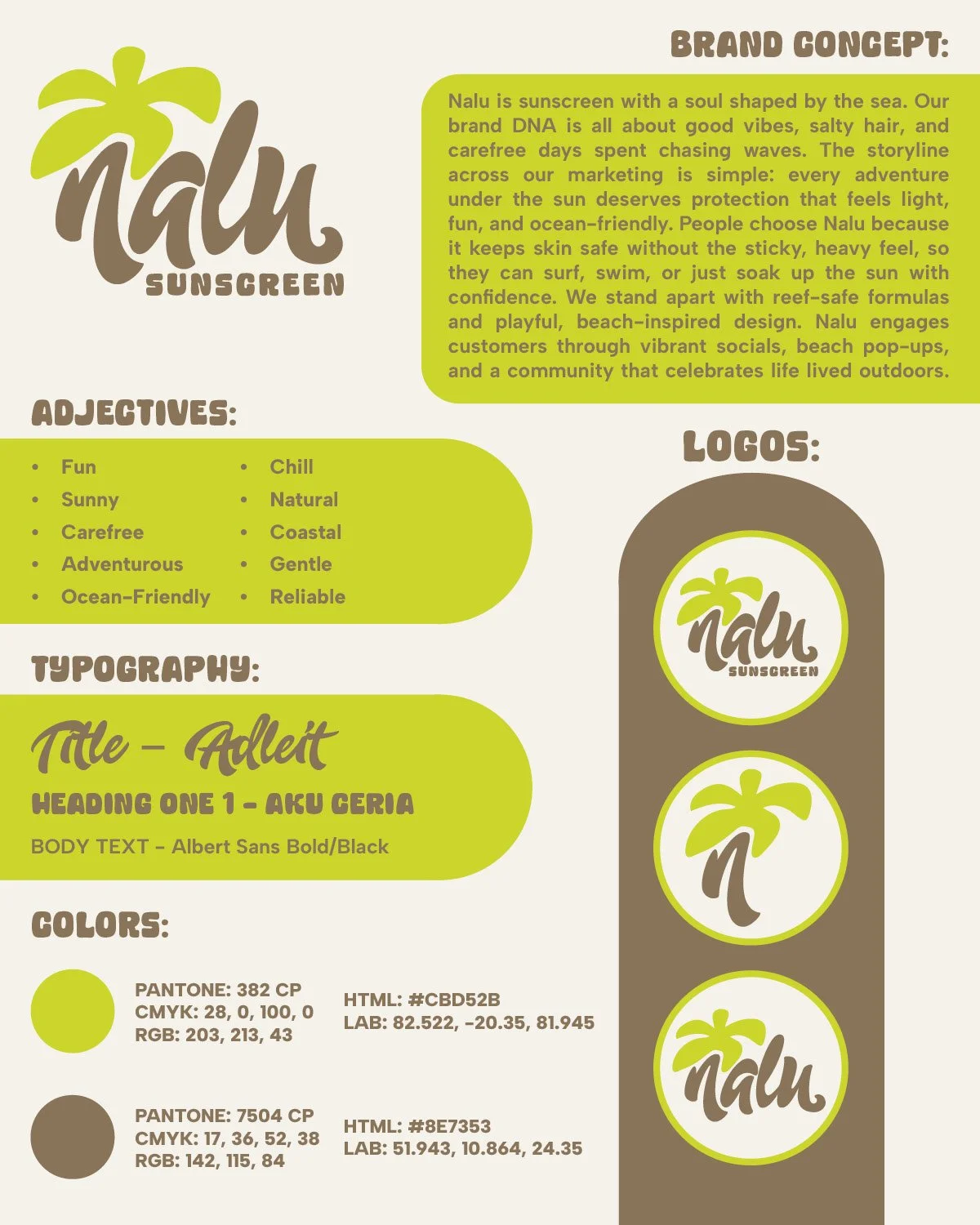 For this project, I developed Nalu, a skin and sunscreen brand inspired by fun, energy, and movement. After individually creating our brand concepts, we were placed into teams and pitched our ideas to one another, with my team selecting my brand, Nalu, to move forward. I then led the team through the development of a cohesive brand identity, defining core elements such as the logo, typography, and a unified color palette. As team lead, I oversaw the application of these elements across a professional set of deliverables that clearly communicated the brand’s aesthetic and message.