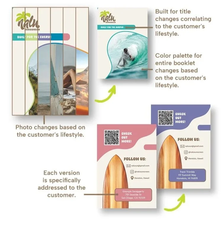 For the Nalu brand, I developed personalized booklets using XMPie software and variable data printing (VDP) to deliver tailored content based on specific customer profiles such as lifestyle, gender, and skin type. I designed a flexible layout system that allowed imagery, messaging, and visual elements to change dynamically for each audience while preserving Nalu’s established brand identity. By integrating data-driven logic with the visual system, each booklet provided a customized, engaging experience, demonstrating how the Nalu brand could scale across personalized print applications.