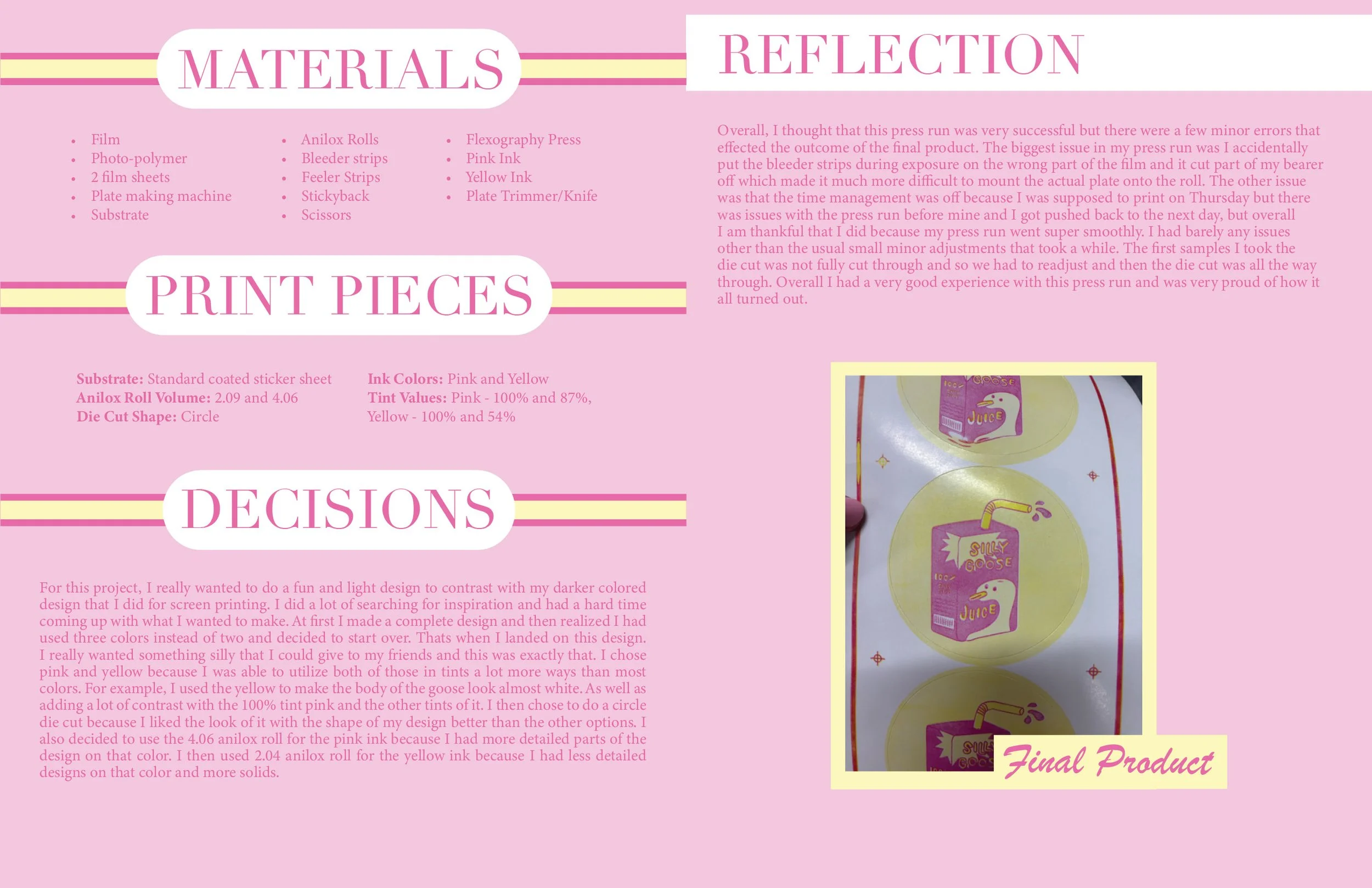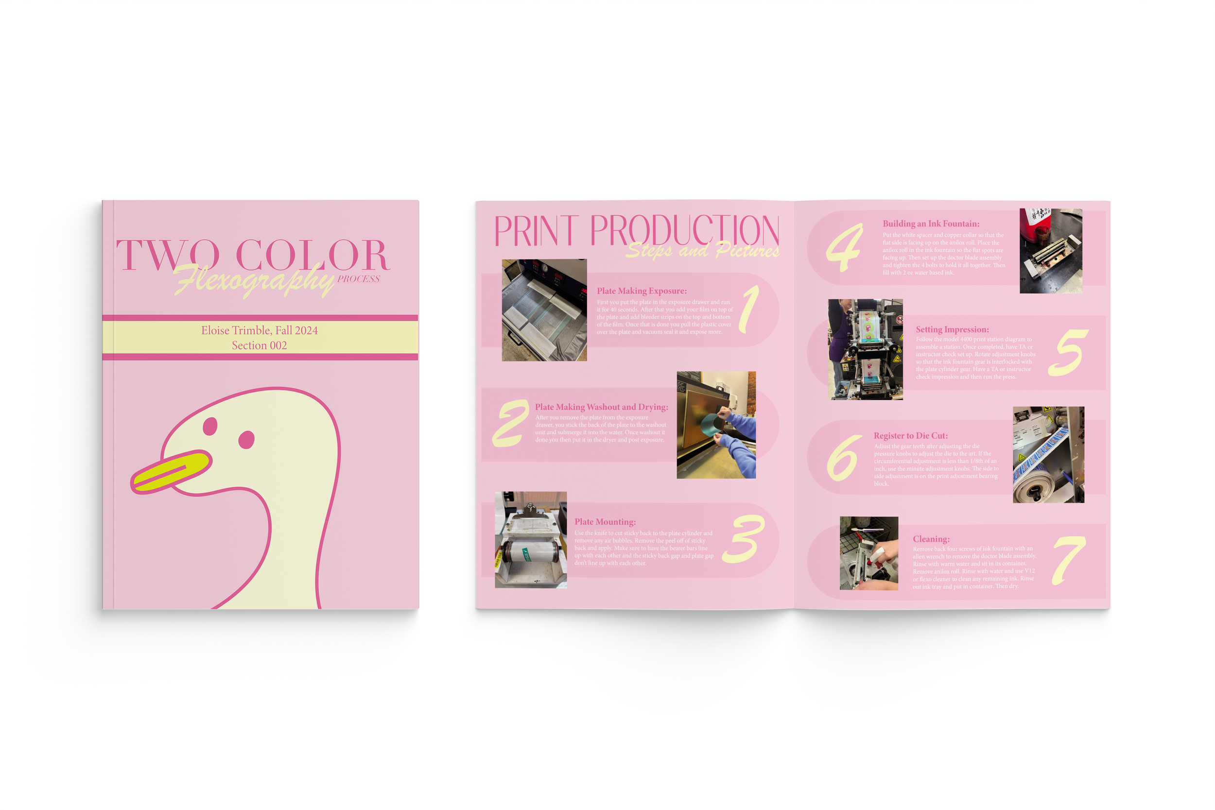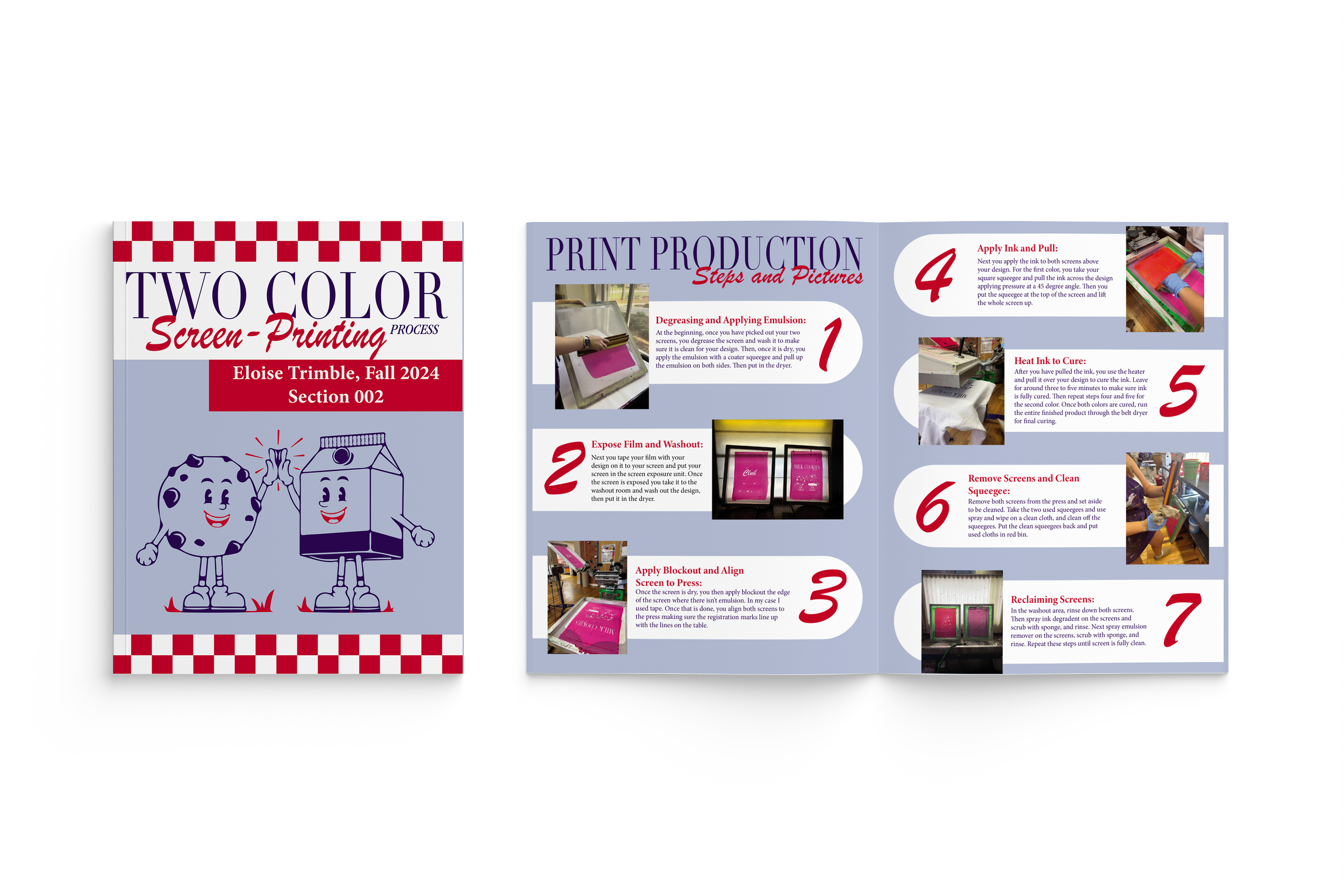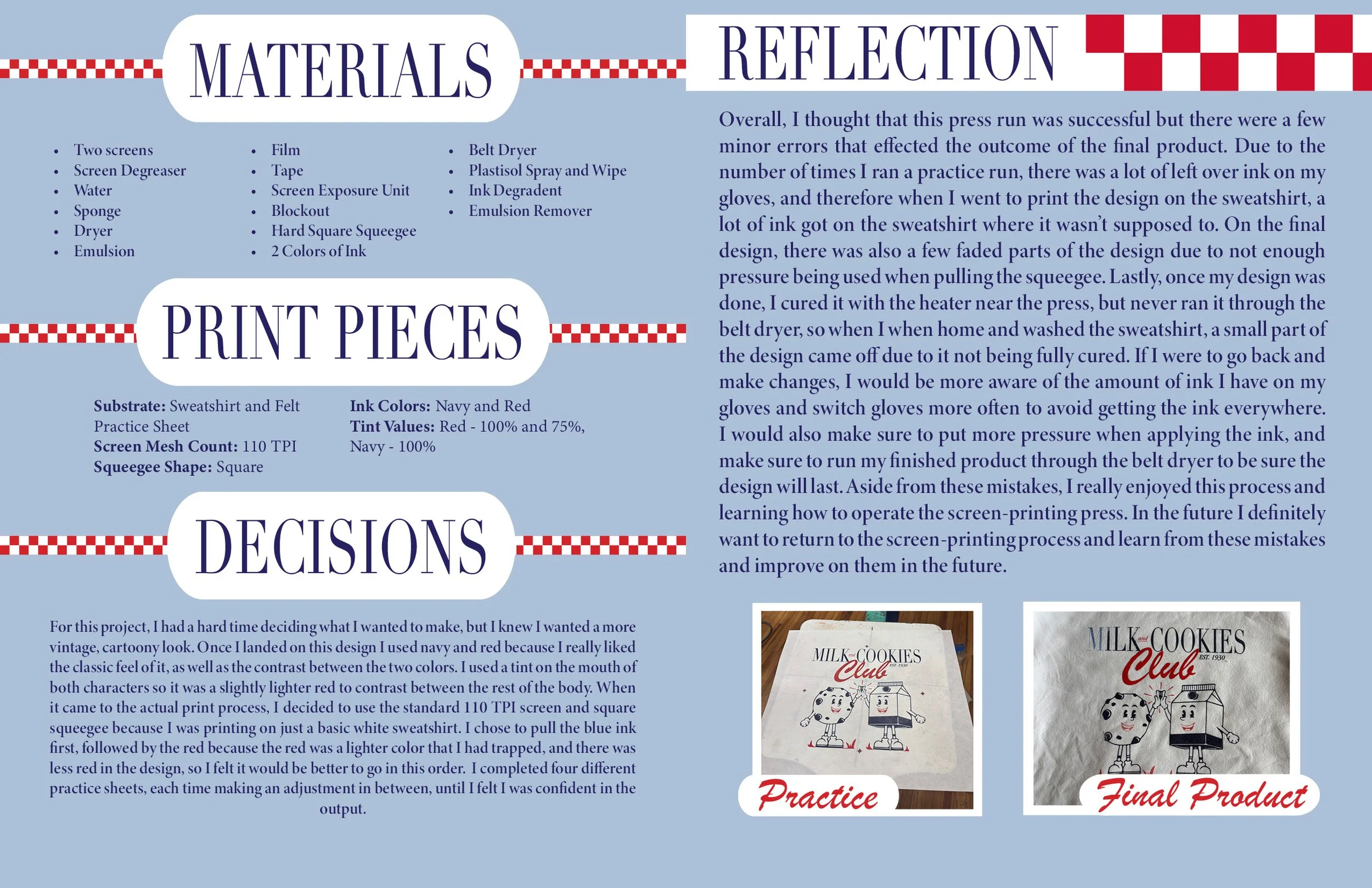 For this project, I produced two booklets that document the complete lifecycle of a design and print assignment, from initial concept through final execution. One booklet presents the finished flexography project, while the other details the design development and screen-printing process. Both include research, ideation, sketches, iterations, materials, and challenges encountered along the way. Together, they provide a comprehensive view of my workflow, highlighting key decisions, creative growth, and reflective insights. Rather than focusing solely on the final outcome, these booklets tell the story of the project’s evolution, offering a clear look into both the creative and technical dimensions of my work.